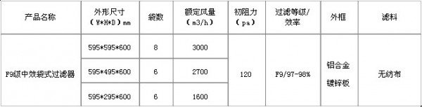 F9級袋式中效過濾器常見的規(guī)格尺寸